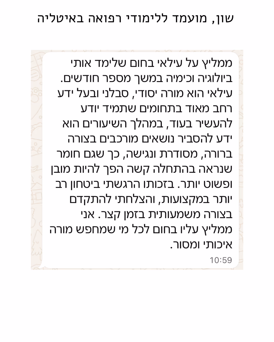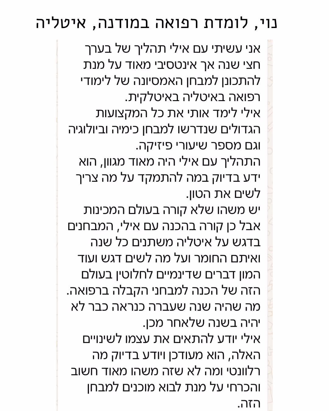 למי שיש רצון להיות רופא אבל צריך מישהו שיוביל אותו יד ביד - אם אתה רוצה להצליח, אבל צריך סדר, מסגרת, והכוונה מקצועית, כאן אתה תקבל את זה ברמה מאוד גבוהה.